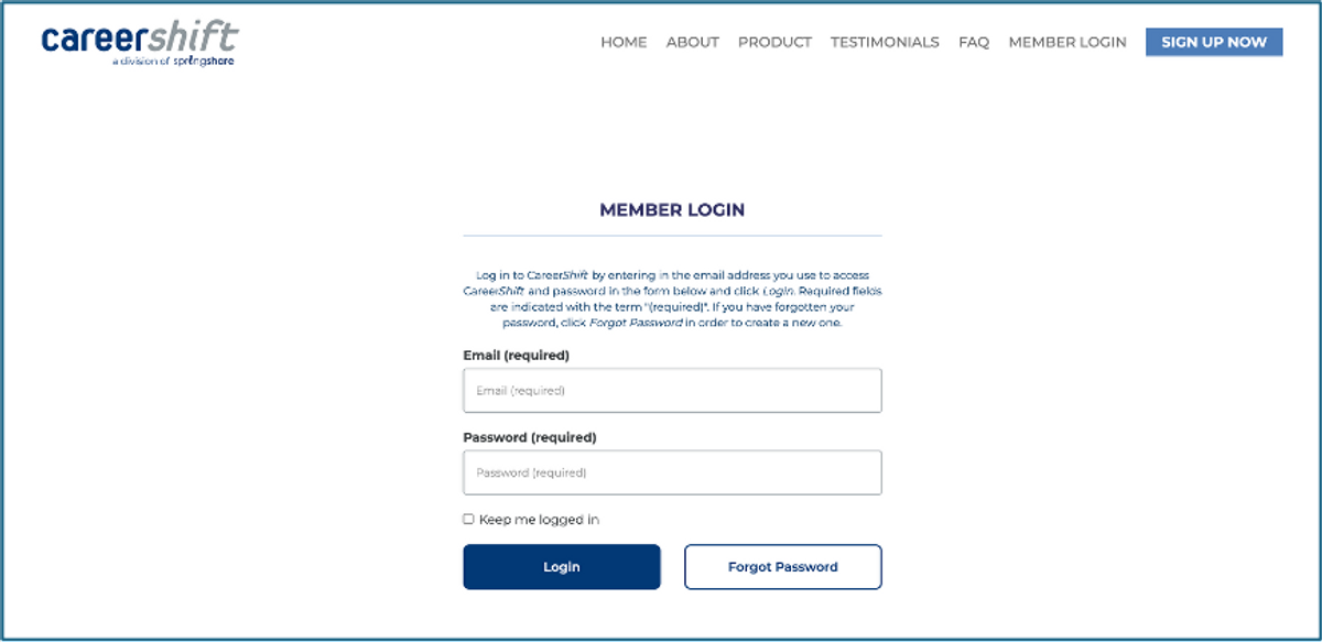 After your account is created, go to the Member Login page. Enter your email and password, then click Login to start using CareerShift.