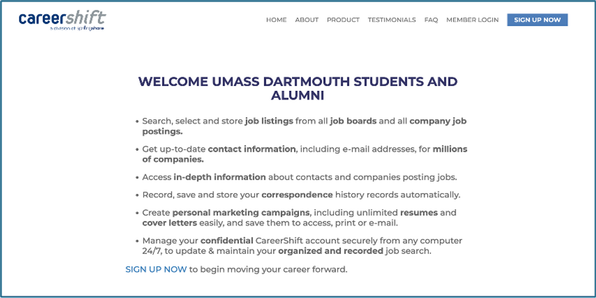 Looking for jobs, internships, or alumni connections? Whatever you are looking for, CareerShift helps you go beyond traditional job boards and allows you to uncover opportunities that other platforms often miss. Find hidden opportunities, access employer contact information, and organize your job search in one central place, all free for UMass Dartmouth students and alumni.