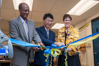 Drs. Meressi, Guo and Jacobs cut the ribbon