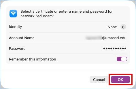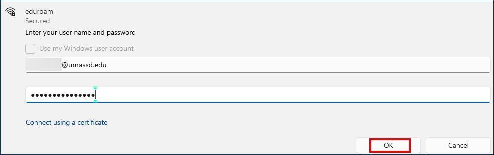 3. Enter the following Network details using your full UMass Dartmouth email address and logon password in the identity section: