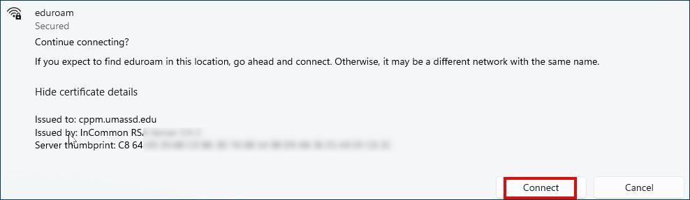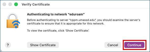 5. Select continue to accept the security certificate and complete the connection to eduroam wifi.