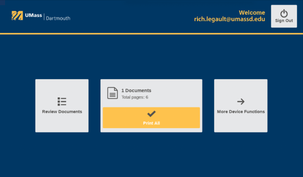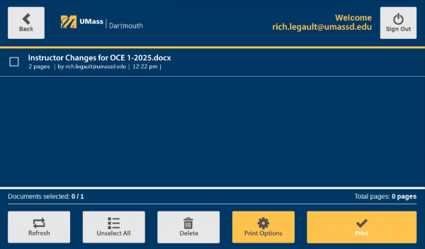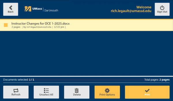 Remember that you must first send a print job to the PrintLess queue unless you are using other functions at the PrintLess station (scan to UMassD email or copying).