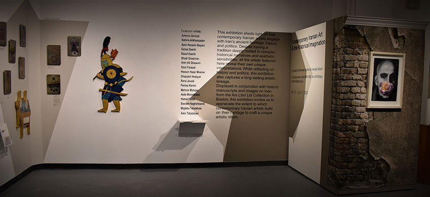 The Exhibition features high-quality artworks from the collections of Azita Bina, Elmar Seibel, Ars Libri Ltd., Gallery Kayafas as well as personal collections of several Iranian and Iranian-American artists. The exhibition sheds light on how contemporary Iranian artists engage with Iran’s ancient heritage, history, and politics. Despite having a tradition deeply rooted in complex historical narratives and aesthetic sensibilities, all the artists featured here reveal their own unique interpretations. While reflecting on history and politics, this exhibition also captures a long-lasting artistic lineage. Displayed in conjunction with historic manuscripts and images on loan from the private collection of Elmar Seibel and Ars Libri Ltd in Boston, this exhibition invites us to appreciate the extent to which contemporary Iranian artists build on their heritage to craft a unique artistic idiom.