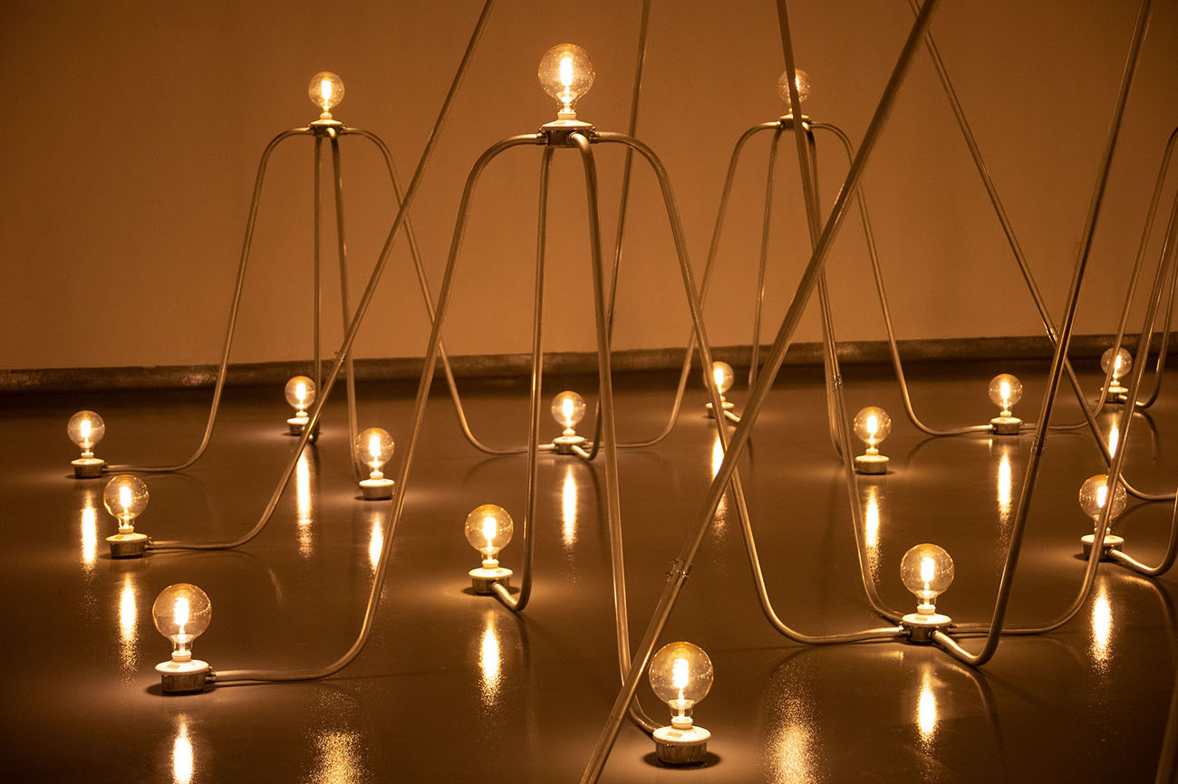 This dynamic, large-scale illuminated artwork responds to the specifics of each exhibition space. In the last academic year, three senior UMass Dartmouth electrical engineering students, Shedricke Mulbah, Derrick Manu, and Matthew LaVoie, worked closely with the Foundation, and CVPA Technician Shingo Furukawa, on designing this immersive room of bent circuits.