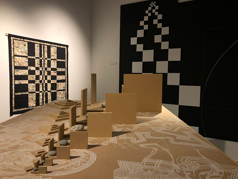 The installation, in part, reflects the research of Dr. Christopher Powell in his 2010 dissertation, The Shapes of Sacred Space on the geometry of Mayan art and architecture.