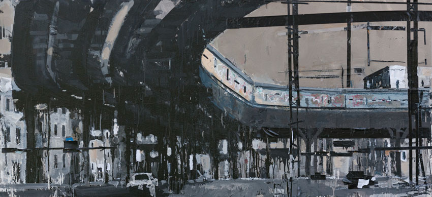 This solo exhibition of new works by Mark Freedman features paintings from urban environments and calls our attention to their ability to capture and hold light. Their industrial derivations also seep into the paintings through the music Freedman was immersed in as he painted, like the rhythmic repetition of bridges and trains. In Freedman's abstracted cityscapes, there are no people, just drips of paints, covered occasionally by tape, layers of tape, or additional paint, in a loud, yet melancholic fashion.