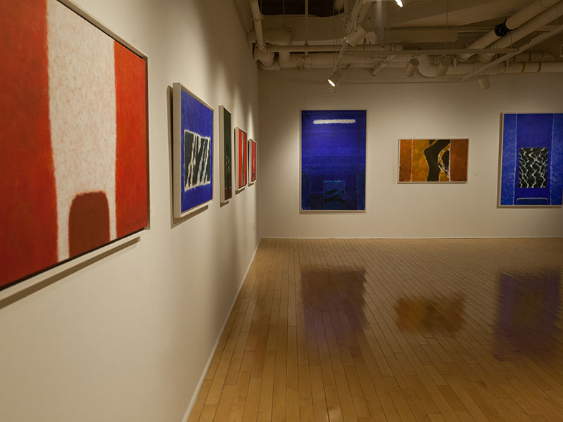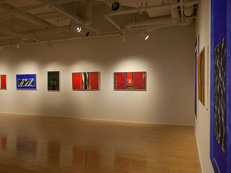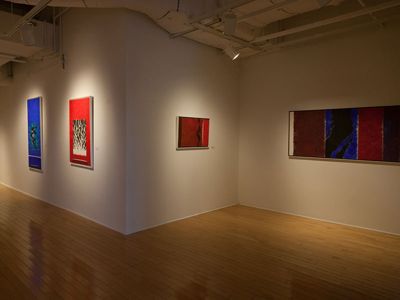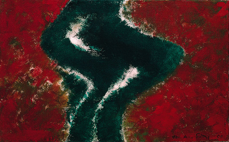As was the case for many artists of his generation, Sigg started as a figurative painter. He grew up on a farm in hilly Switzerland and was drawn predictably to the beauty of the landscape. After his studies in Zurich and later in Paris, in 1968 he became Swissair’s ‘Artist in Resident in the Sky’. As such, he was permitted to sit next to the pilot as the plane flew. Understandably, he became fascinated by the aerial views of the landscapes where distant shapes turned into calligraphic signs. Sketching the vast landscapes from 30,000 feet above ground, the rivers became meditative curves, patches of land became color fields and details disappeared into clouds and a meditative stillness. This experience informed Sigg’s later work, presented in this exhibition. The titles of this graceful pieces spanning from1994 to 2010 such as Meditative II, Mystery, Dreamed IV, Within the Red III, In the Middle Realm III, and The Small Sign point to these canvases’ lyrical abstraction and their poetic nature where one can get lost in layers of acrylic color, abstracted signs and reflection.