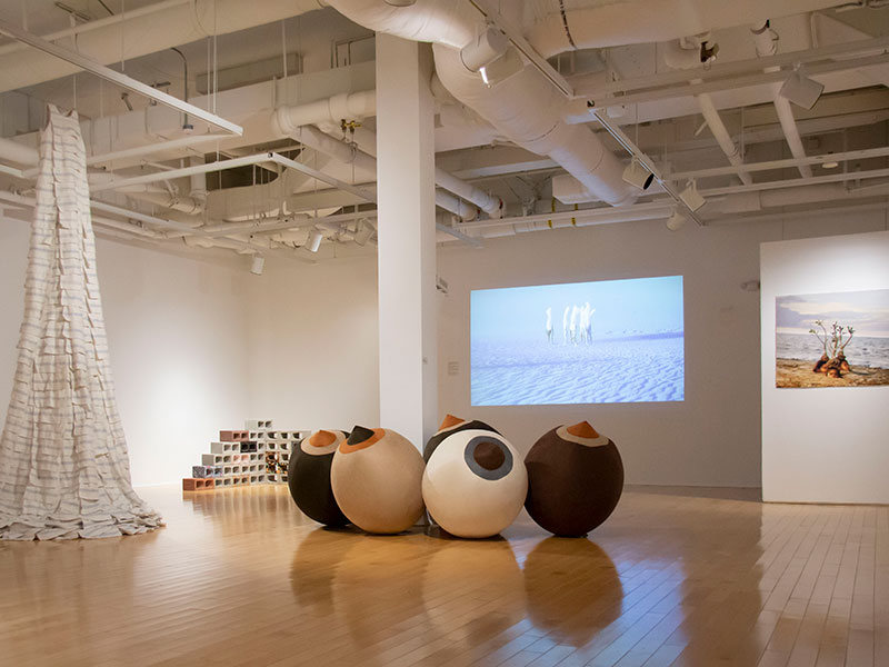 As an artist, Raquel Paiewonsky is both bold and subtle. She wraps the edges of heavy bricks in patterned fabric, softening the impact of the wall, perceived as a “male” element. Connections, community, softness, all seen as female attributes are a part of her work, while the “Muro” tells a story about gender imbalance within society or within ourselves. This soft sculpture/installation that has its own space at the University Art Gallery, consists of 2000 hand-embroidered breasts of different skintones. It is the super-mother of all mothers, the feminine wit, a critical commentary towards a society that she describes as driven by economic need and greed. Raquel is also questioning stereotypes and expectations in her photography. Her images are surprising, imaginative, personal, playful, as well as thoughtful. A tall dress made out of cleaning rags monumentalizes the woman, the cleaner, so often overlooked. Her video Isopolis invites viewers for an unexpected journey to sand dunes and a beach, following a group of performers telling a story of inclusion and conventions, full of symbolism without words. Even though Paiewonsky draws from her experience as an artist in the Dominican Republic, her message rings loud and clear to a perceptive visitor of any origin, race, or gender. We invite you to immerse yourself in the magic world of InsideOut - to experience, to question, to feel Paiewonsky’s (and now also your) imaginary world.