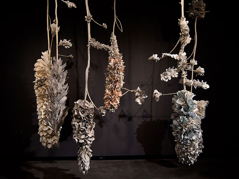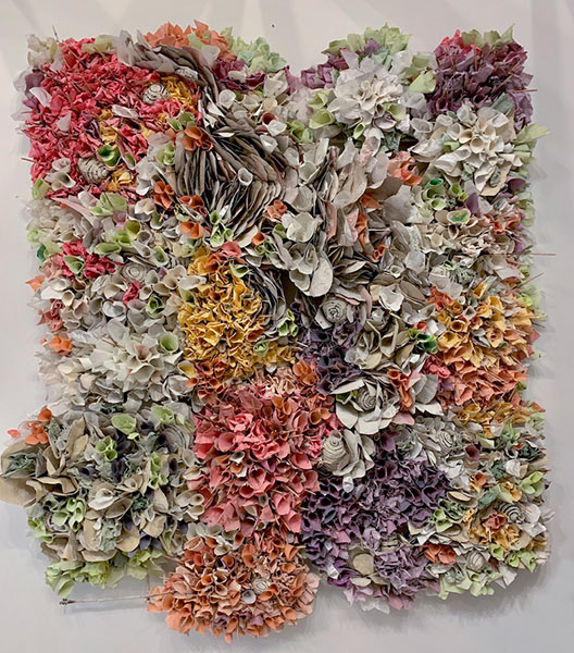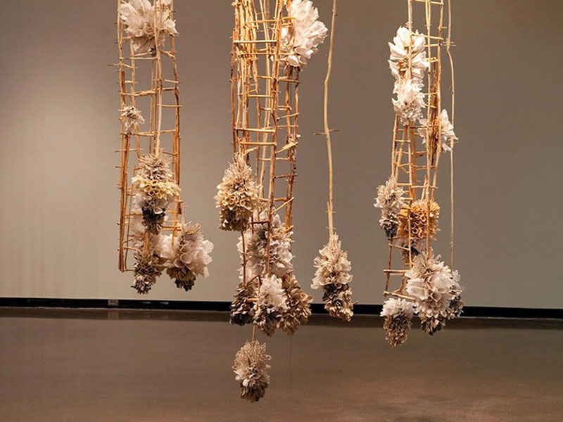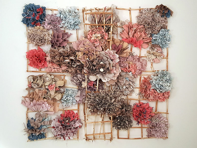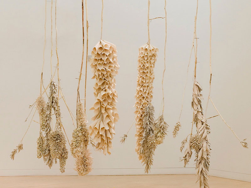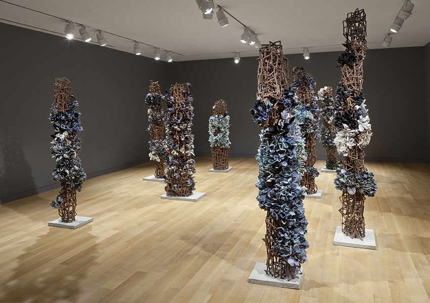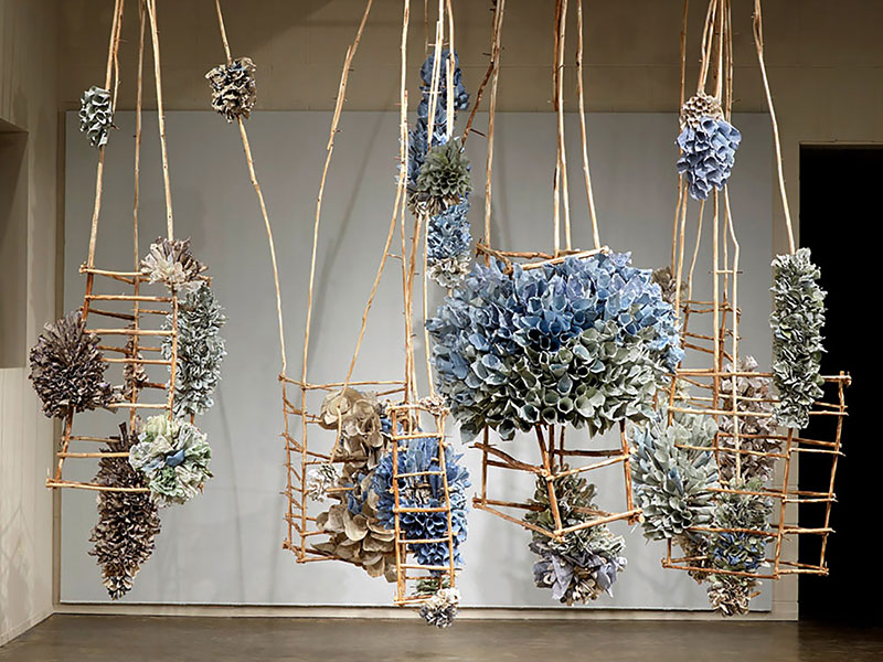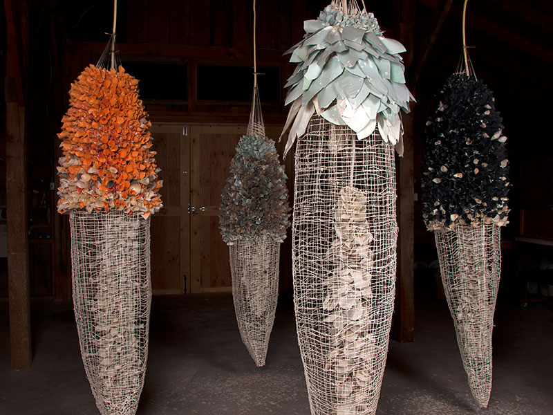 Hutchinson’s sculptural work is informed by observations of the natural world, drawing inspiration from what she sees as its resilience and resourcefulness. Ranging in scale from site-installation museum projects to gallery sculpture, the work is a profusion of color harmonies, floral textures and absorbing detail. Found embedded in her work are locally sourced materials—native and natural as well as industrial and domestic cast-offs. The work is attentive to the emerging concerns of the Anthropocene: sustainability as an ethos, hybridity as a strategy, and growth as a set of negotiations. Her current work explores the theme of navigating boundaries both conceptually and aesthetically.
