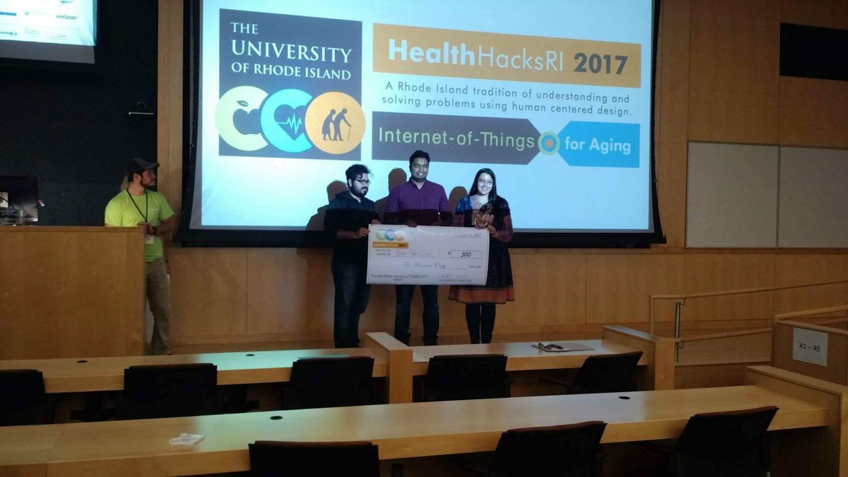 This past weekend a team from University of Massachusetts Dartmouth consisting of Electrical Engineer Md Shaad Mahmud (a Ph.D. candidate in Electrical and Computer Engineering Department), Bioengineer Erika Naumann Gaillat (A Master student in Bioengineering Department), and Computer Engineer Esfar Turzo (A Master student in Electrical and Computer Engineering Department), attended the HealthHacks RI competition, which took place in the University of Rhode Island. A total of 36 participants from URI, WPI, Harvard, Brown and UMass Dartmouth attended this competition. The main subject of this competition was “Internet-of-Things for Aging Population.” This overall theme helped expose the growing need for new technology for the increasing population of the elderly.