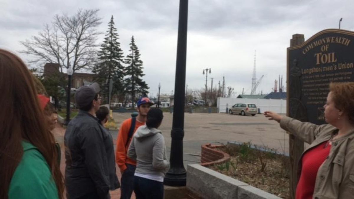 On a labor history tour for UMass Dartmouth students, Kim Wilson points to the piers while standing in front of the Monument to the Longshoreman's Union which was funded by the Massachusetts AFL-CIO and dedicated in a celebration organized by the Labor Education Center.