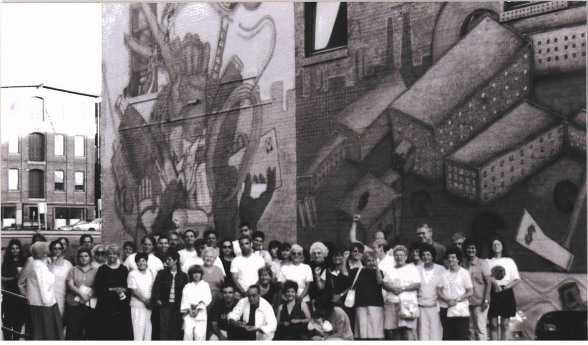 The New Bedford mural was created in October 2001 by Dan Devenny, noted muralist from Belfast, Ireland. It is located near the corner of Sixth and Spring Streets. Funding came from the Massachusetts Foundation for the Humanities, the UMass Dartmouth Arnold M. Dubin Labor Education Center, the Community Building Mini-grants Program, the company and workers of Riverside Clothing and many labor unions and individuals. Thanks to the many volunteers and our state senator.