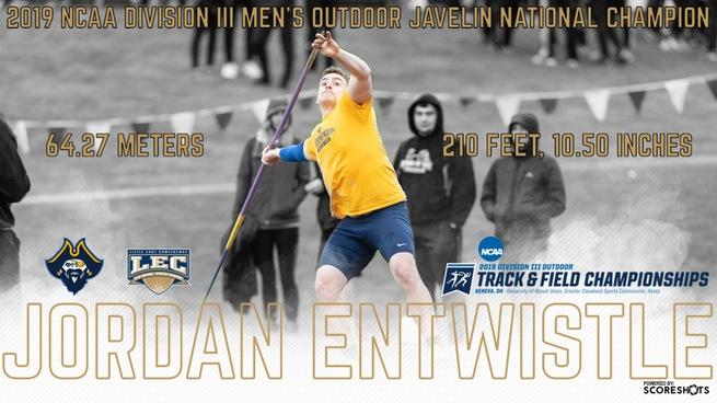 Entwistle, who entered the competition as the top national seed in the event, claimed the Corsairs’ 12th overall individual national crown in all sports and first in 11 years, as his fourth attempt of the night produced the winning mark of 64.27 meters/210 feet, 10 ½ inches and topped runner-up Grant Smith of Transylvania by nearly two feet. Jordan, who earned All-America honors with a fourth place finish at last year’s NCAA outdoor championships, becomes the second two-time All-America men’s javelin performer in school history, as Keith Rose first achieved that feat in 1996 and again in 1997.