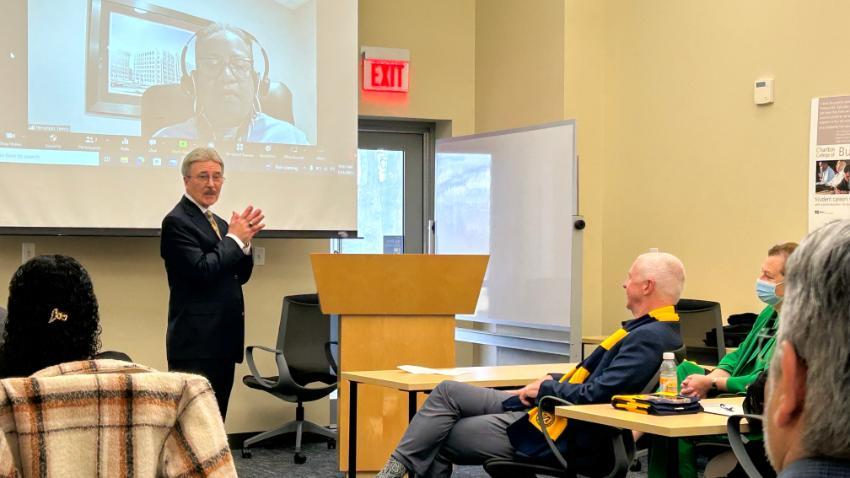 John Williams, Dean of the Charlton College of Business, began the reception with a welcome to the CCB and UMass Dartmouth, followed by remarks and congratulations from BayCoast Vice President for Human Resources, Scott Lopes and Vice President for Diversity, Equity, and Inclusion, Helena Moronta, Bristol Community College President Laura L. Douglas, Dean of Business and Experiential Education, Vinnie Rege, and UMass Dartmouth Chancellor Mark Fuller and Vice Chancellor for Advancement Dean Hickey. BayCoast C.E.O. and CCB Board member Nicholas Christ, and other BayCoast, BCC, and CCB leaders were in attendance.