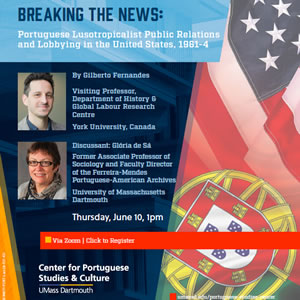 Please join us and the Ferreira-Mendes Portuguese-American Archives for a virtual presentation by Dr. Gilberto Fernandes titled "Breaking the News: Portuguese Lusotropicalist Public Relations and Lobbying in the United States, 1961-4," with the special participation of Prof. Glória de Sá.