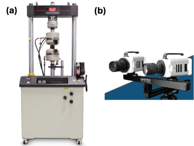 The Instron Hydraulic Materials Testing Device (a) with Digital Image Correlation (DIC) (b) facility enables comprehensive evaluation of material behavior under static, cyclic, and fatigue loading. Equipped with a 100 kN load cell and a double-acting servohydraulic actuator, the Instron system supports testing of a wide range of materials - including plastics, metals, composites, and ceramics. The integrated 3D Digital Image Correlation (DIC) technology provides full-field deformation measurements, enabling detailed analysis of failure mechanisms. This system significantly expands testing capabilities beyond existing lab equipment, which is limited to static testing of low-strength materials.